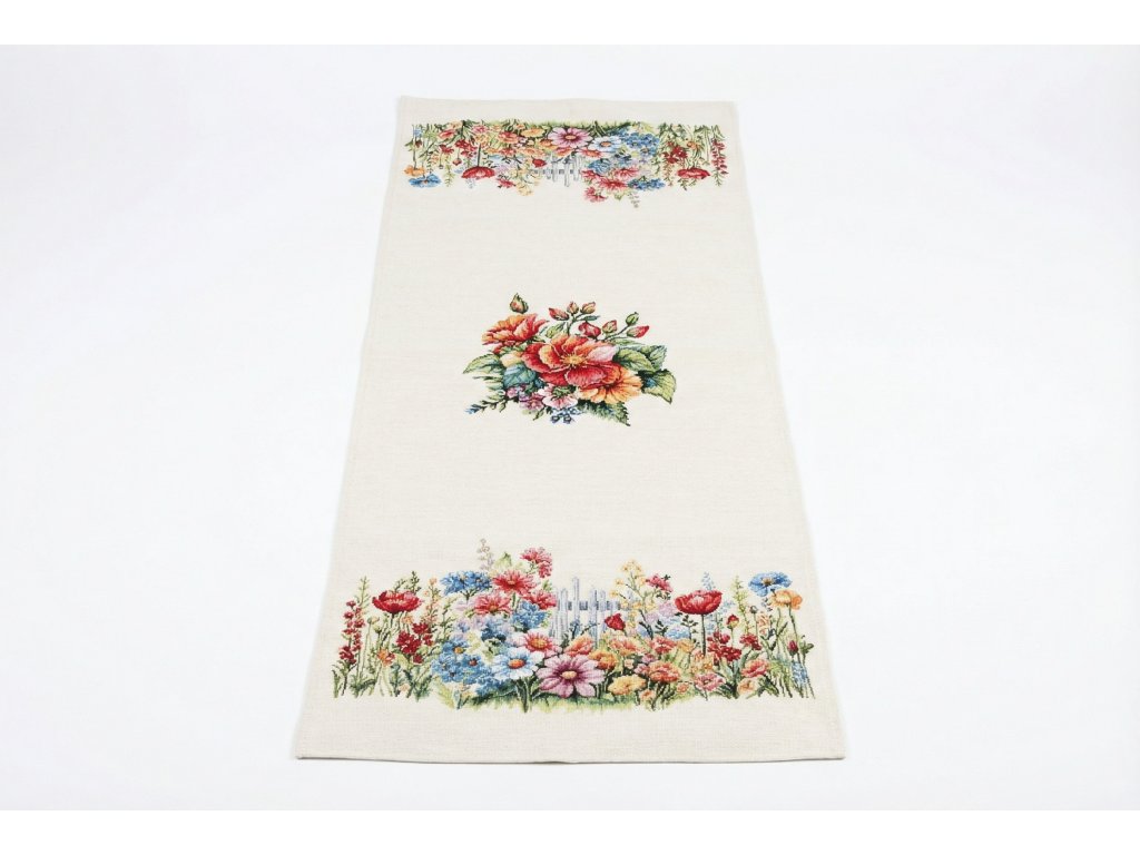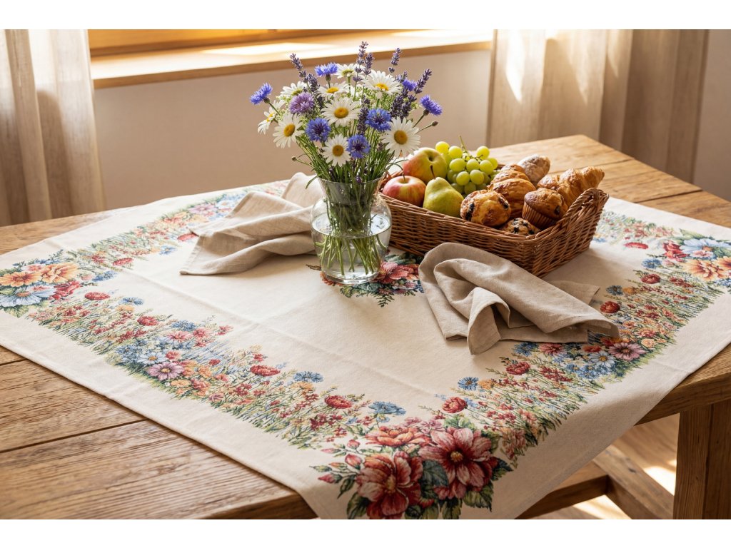 Po celém obvodu vede bohatá luční květinová bordura – směs květů a trav v pestrých barvách (červená, růžová, oranžová, modrá, fialová, žlutá) se zelenými listy. V rozích jsou výraznější květinové shluky, které ubrus opticky „zarámují“ a dodají mu slavnostnější vzhled. Uprostřed je menší středový květinový motiv v teplých tónech, který jemně propojuje celý design.