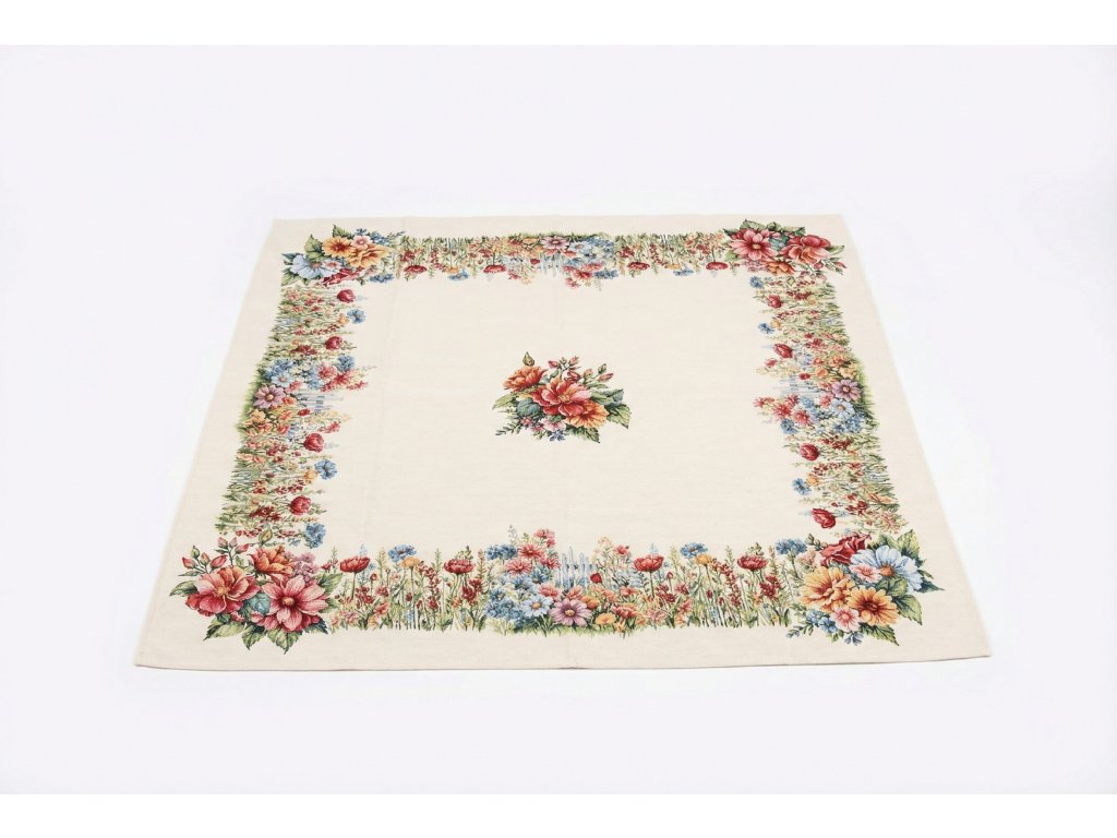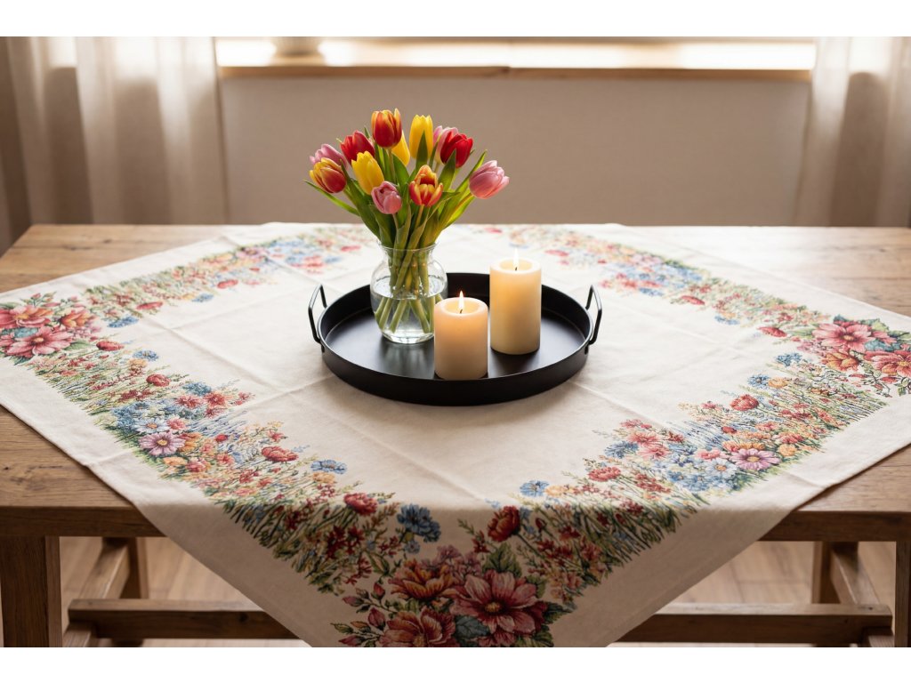 Po celém obvodu vede bohatá luční květinová bordura – směs květů a trav v pestrých barvách (červená, růžová, oranžová, modrá, fialová, žlutá) se zelenými listy. V rozích jsou výraznější květinové shluky, které ubrus opticky „zarámují“ a dodají mu slavnostnější vzhled. Uprostřed je menší středový květinový motiv v teplých tónech, který jemně propojuje celý design.