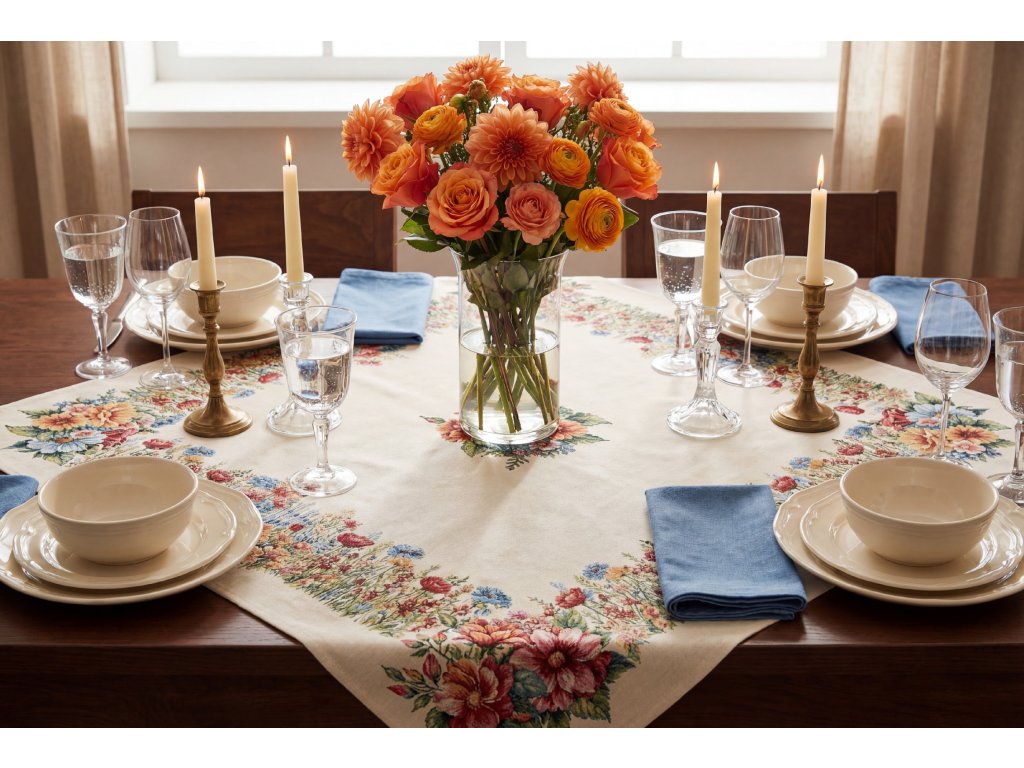 Proč funguje: navážeš na luční borduru a ubrus působí útulně.