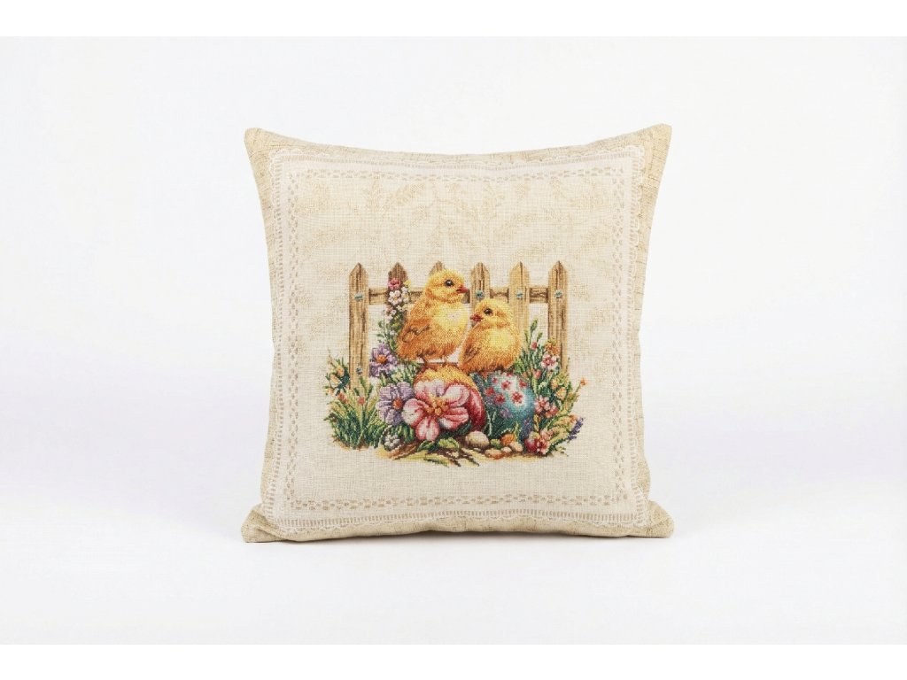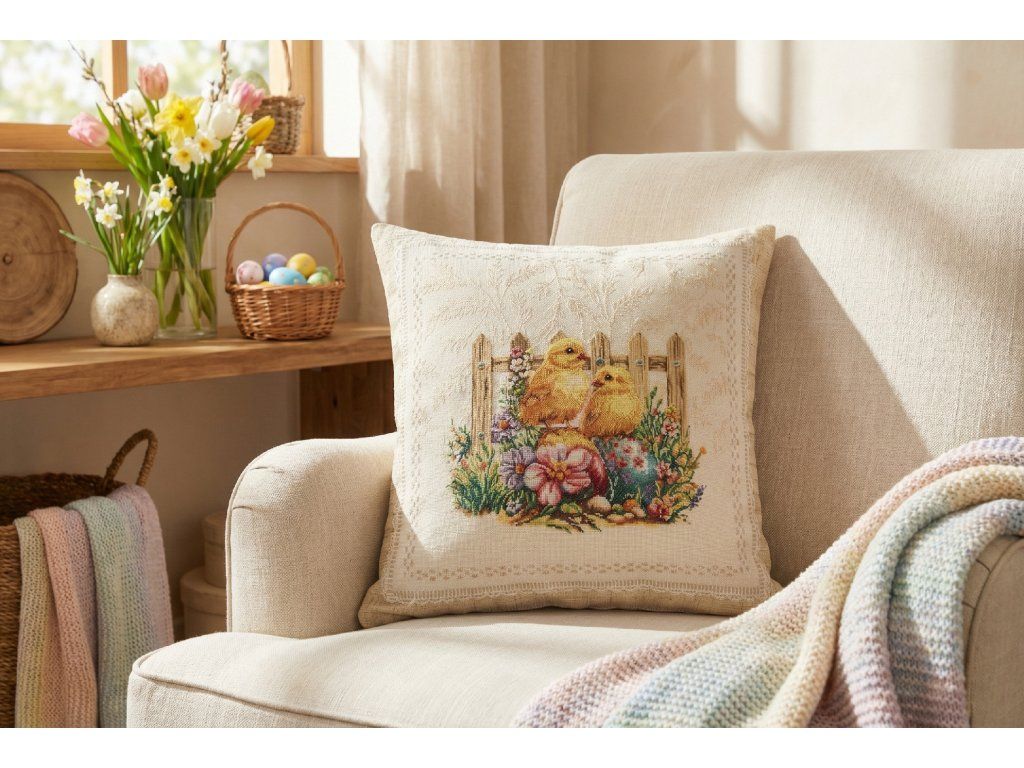 Vneste do interiéru něžnou atmosféru jara. Světlý gobelínový povlak s tkaným motivem dvou žlutých kuřátek u dřevěného plotu doplňují barevná velikonoční vajíčka, růžový květ a drobné kvítky. Decentní ornamentální rámeček po obvodu působí elegantně a podtrhuje venkovský „vintage“ styl.