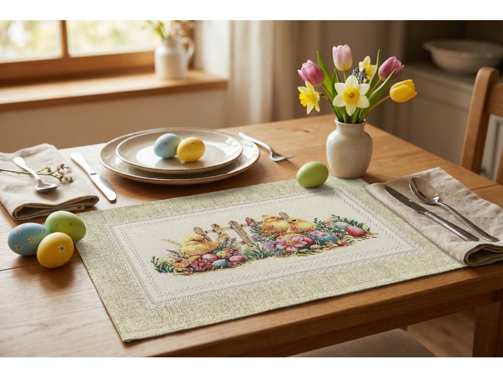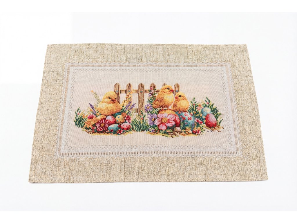 Gobelínové prostírání 35x50 Kuře Velikonoce je ideálním doplňkem pro váš domov během jarních a velikonočních svátků. Toto prostírání v přírodním béžovém tónu přináší do vašeho interiéru dotek elegance a útulnosti. Středový motiv představuje tři roztomilá žlutá kuřátka u dřevěného plaňkového plotu, obklopená barevnými vajíčky a bohatými květy v odstínech růžové, fialové a zelené. Tento nádherný motiv je zasazen do světlého obdélníkového pole, které je po obvodu zdobeno jemným dekorativním lemem připomínajícím krajkový rámeček.