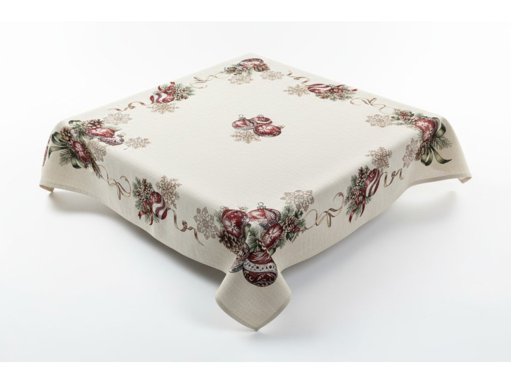 Tento vánoční ubrus s nádherným zimním motivem zdobeným ozdobami, šiškami, stuhami a vločkami vytváří teplou a přívětivou vánoční atmosféru. Elegance a sofistikovaný design na světlém pozadí dodávají vaší vánoční tabuli klasický šarm a eleganci. Vyrobeno z vysoce kvalitní látky je tento ubrus ideální pro vytvoření nezapomenutelných svátečních setkání a zvýraznění vaší sezónní výzdoby.