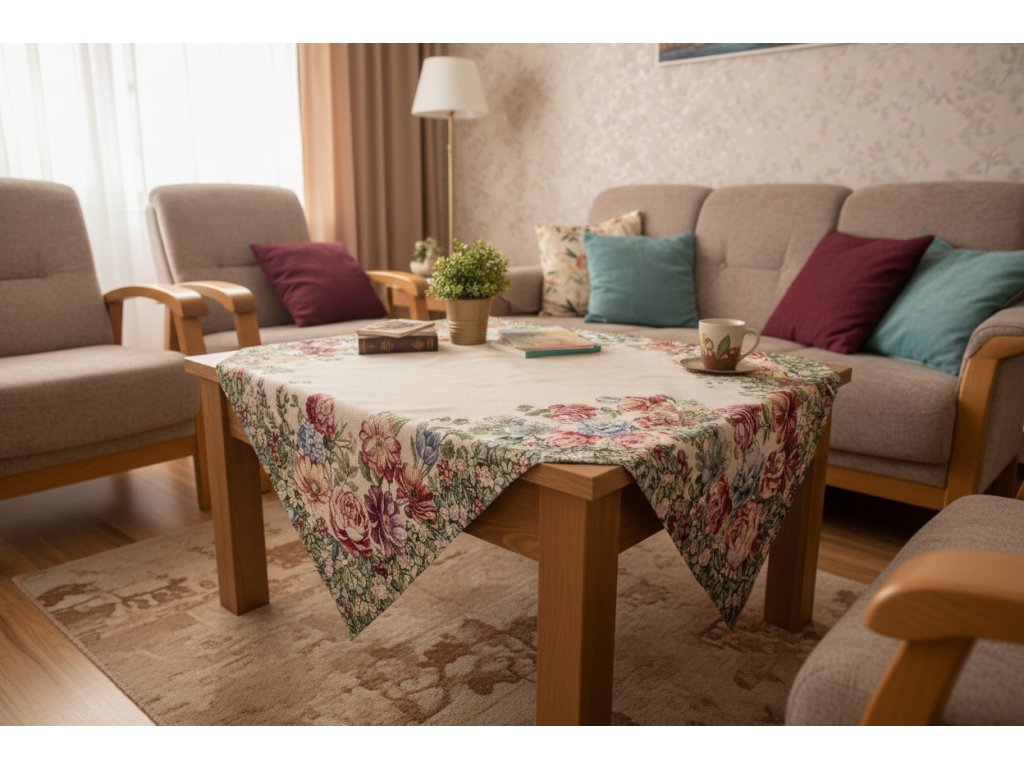 - Velikost: 100x100 cm, ideální pro středně velké stoly, kde se stane ústředním bodem vaší jídelny.