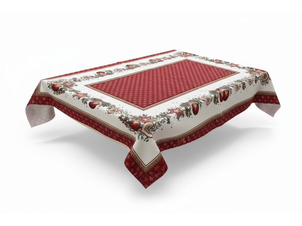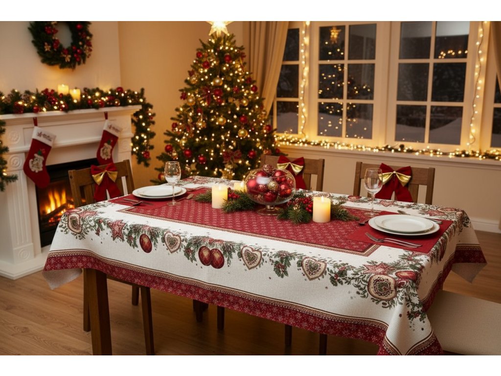 Tento vánoční ubrus s výrazným designem má bohatý červený okraj a složité vánoční motivy. Je zdoben vánočními hvězdami, srdci, ozdobami a bohatou zelení, čímž přináší teplo a radost do vašeho jídelního prostředí. Vyrobený z vysoce kvalitní látky, tento ubrus přidává sezónní eleganci a šarm, ideální pro zvýraznění vaší vánoční výzdoby a vytváření nezapomenutelných svátečních setkání.