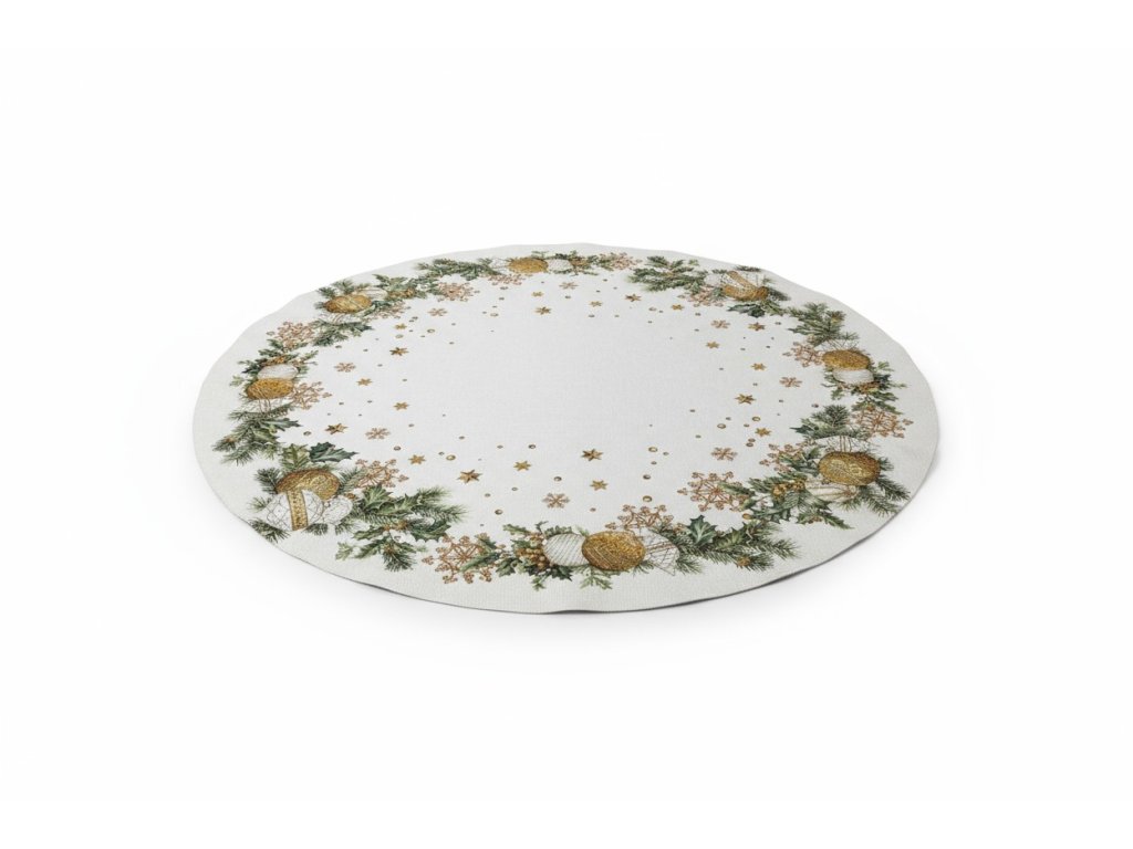 Tento dekorativní ubrus má slavnostní vánoční okraj s bohatými jehličnatými větvičkami, šiškami, ořechy a třpytivými zlatými ozdobami, které jsou krásně uspořádány kolem okrajů. Neutrální pozadí zvýrazňuje elegantní vánoční design, což jej činí ideálním pro vytváření teplé a přívětivé atmosféry během sváteční sezóny. Vyrobeno z vysoce kvalitní látky, toto prostírání přidává do vašeho stolování nebo vánoční výzdoby nádech sezónní elegance a kouzla.