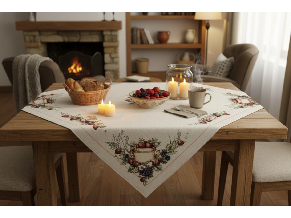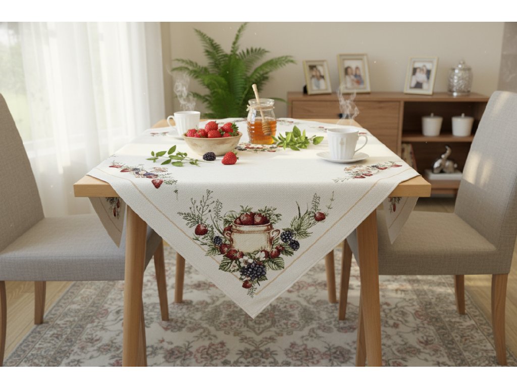 Představte si, jak váš stůl ožívá s tímto krásným ubrusem. Je to jako přinést kousek přírody přímo do vašeho domova. Motiv jahod nejenže dodá vašemu interiéru svěžest a barvy, ale také vykouzlí úsměv na tváři každého, kdo usedne k vašemu stolu. Nechte se inspirovat a vytvořte z vašeho jídelního prostoru místo, kde se bude každý cítit vítán a v pohodě.