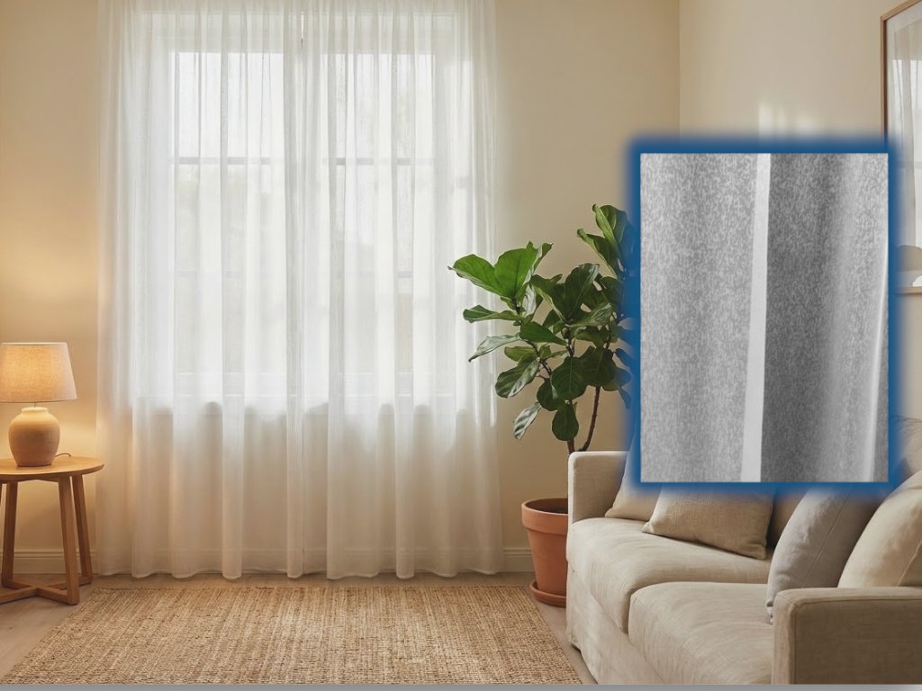 Záclona je poloprůhledná, což znamená, že filtruje světlo a vytváří jemný vertikální akcent bez ostrých kontrastů. Při nařasení se pásy skládají do pravidelných vln, které drží svislou linii a přidávají texturu a hloubku do vašeho prostoru. Přirozené světlo vytváří jemný přechod od jasných po stínované plochy, což zdůrazňuje texturu a dodává interiéru klidný a harmonický vzhled.