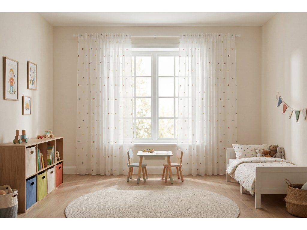 Tkaná záclona v bílé barvě s jemným, pravidelně se opakujícím barevným puntíkatým motivem působí čistě, lehce a nadčasově. Díky tkané struktuře má záclona příjemně stabilní vzhled, dobře drží tvar a při zavěšení elegantně splývá. Transparentní charakter materiálu propouští denní světlo do místnosti, ale zároveň zjemňuje pohled zvenku a dodává oknům upravený, útulný dojem.