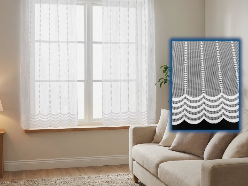 Nejvýraznějším prvkem záclony je její dekorativní spodní část, zakončená elegantním vlnitým lemem. Tento vlnitý motiv se nad ním několikrát opakuje v podobě horizontálních pásů, což zácloně dodává sofistikovaný a ucelený vzhled. Zubatý design a postupné zmenšování vlnek směrem dolů vytváří jemný přechod, který zácloně dodává romantický a vintage nádech.